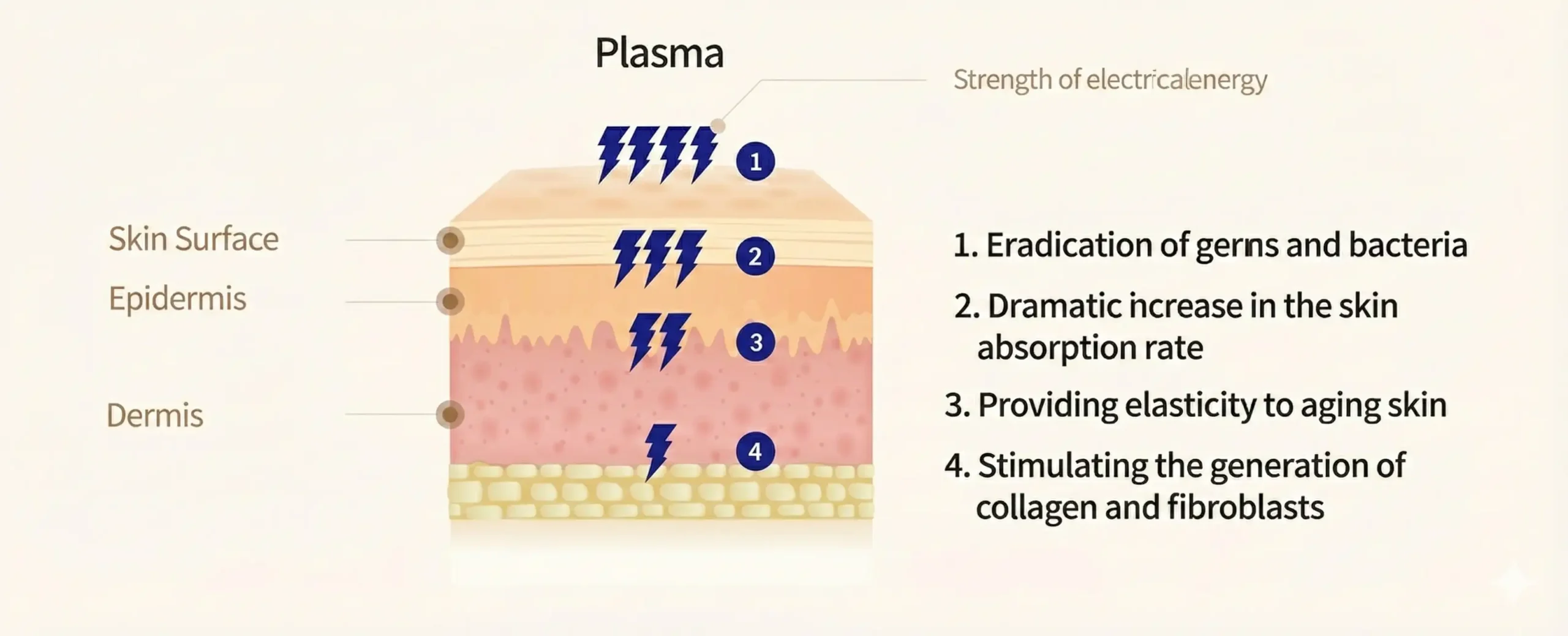 Plasma, which accounts for 99.9% of the Universe, is a fourth material form of ionized gas along with solids, liquids and gases. Plasma is pure natural energy that can be observed in natural phenomena such as lightning and aurora, and can be found in fluorescent lamps, neon signs, air purifiers, disinfectants, and skin regenerators in everyday life. Plasma naturally induces skin peeling by sterilizing the skin and removing various contaminants. In addition, plasma energy stimulates the fibroblasts so that collagen is generated, and skin is regenerated, resulting in elastic skin and wrinkle treatment.
